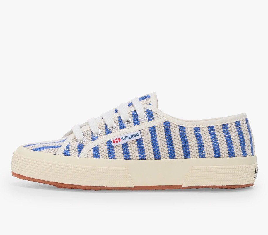 Dieser Schnürsneaker zelebriert Sonnenschein, Meer und Urlaub: Das Obermaterial aus grobgewebter Baumwoll-Canvas mit vertikalen Streifen hat einen Look, der von der italienischen Sommerästhetik inspiriert ist.