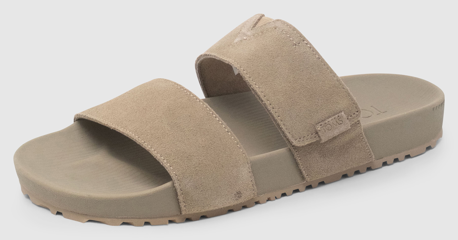 Toms steht auch beim Modell Nico Suede für entspannten Komfort und sommerliches Design. Das Obermaterial aus weichem Suede in der Farbe Dune verleiht dem Schuh eine natürliche, warme Optik und sorgt für eine angenehme Haptik. Charakteristisch ist das zweiriemige Design mit verstellbarem Klettverschluss, das für eine individuelle Passform und einfaches An- und Ausziehen sorgt. Ein lässiger Slide-Sandal, der Komfort, Funktionalität und einen cleanen Sommerlook perfekt verbindet. normal geschnitten